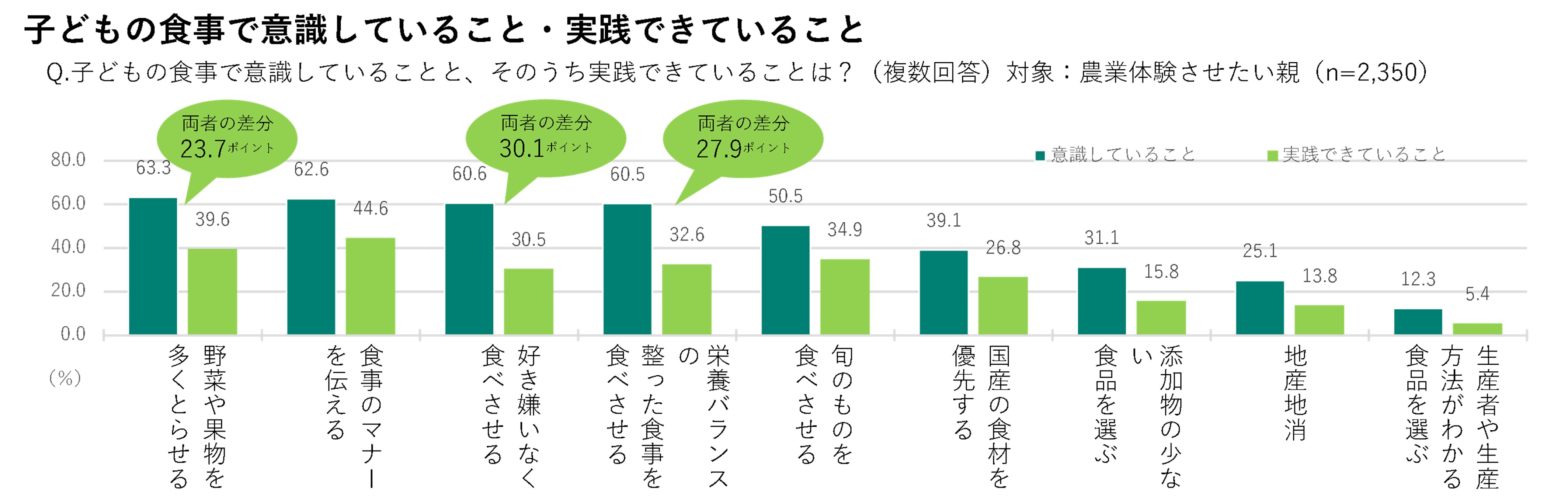 農業体験させたい親に子どもの食事で意識していることを聞くと、「野菜や果物を多くとらせる」(63.3%)、「食事のマナーを伝える」(62.6%)、「好き嫌いなく食べさせる」(60.6%)、「栄養バランスの整った食事を食べさせる」(60.5%)、「旬のものを食べさせる」(50.5%)の順となった。