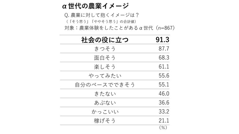 α世代が仕事に就くようになる頃、今とは違う新しい仕事が数多く誕生していると予想されるが、そのような中でも農業はなくなることはなく、今以上に重要性が増すといわれている。新しい農業を担うα世代の活躍が期待できそうな結果となった。