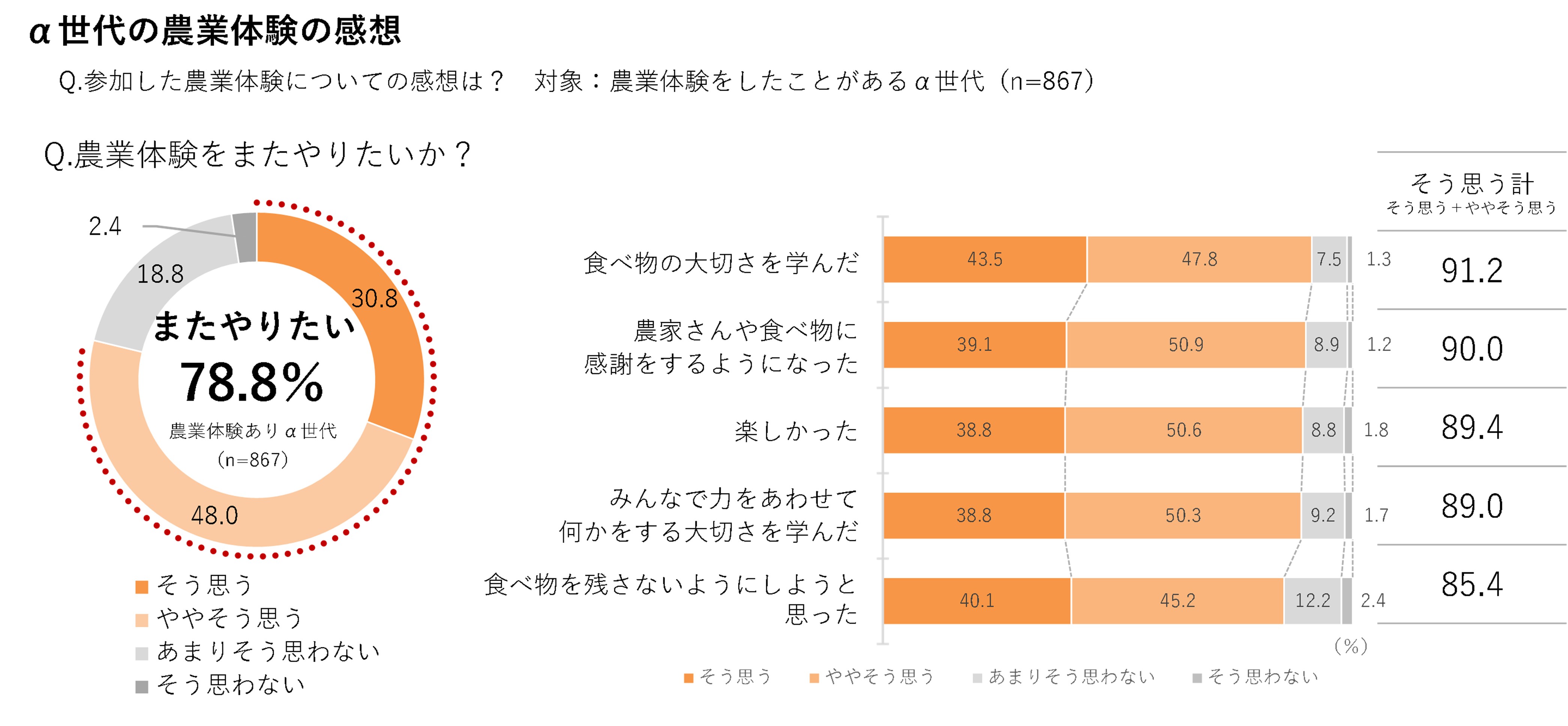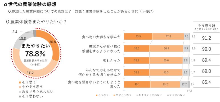 α世代にとっての農業体験は楽しみながらさまざまなことを学べる楽しい経験で、「またやりたい」ものと捉えられている。