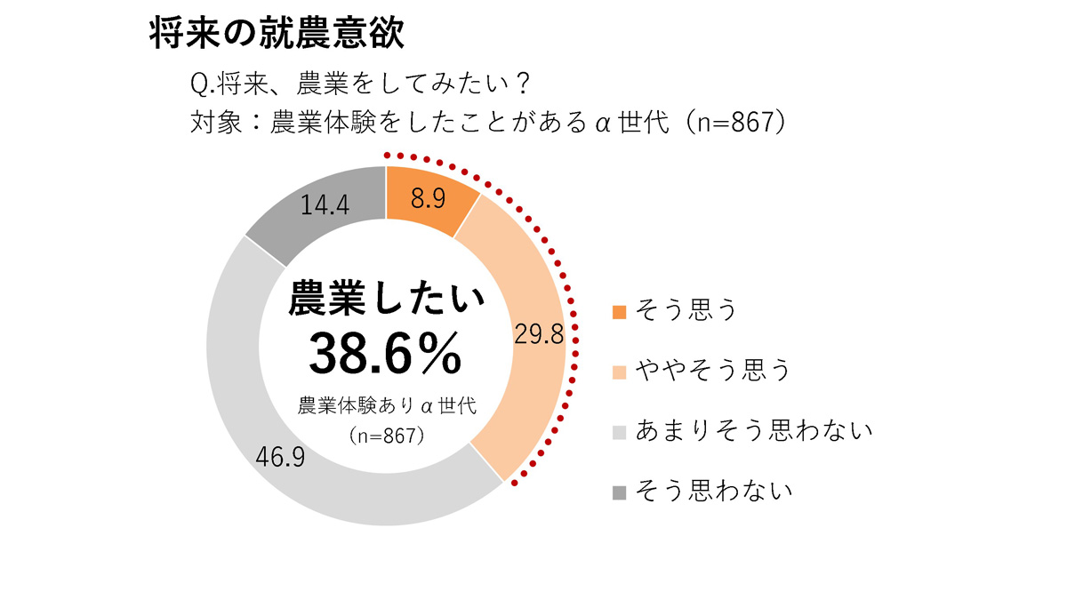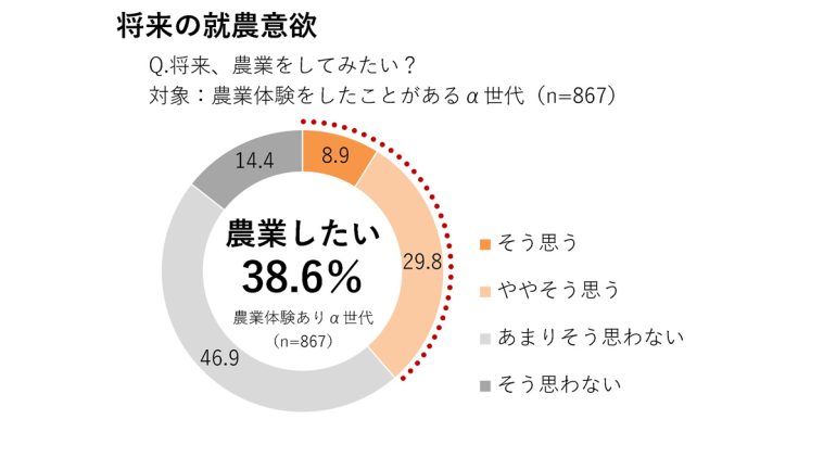 図1の通り、7割以上の人が過去に農業体験をしたことがあるα世代だが、農業体験をしたことがあるα世代に、将来農業をしてみたいか、4段階(そう思う、ややそう思う、あまりそう思わない、そう思わない)で聞いた。すると、4割近くが「将来、農業をしてみたい」(38.6%=そう思う8.9%+ややそう思う29.8%)と意欲を示した[図15]。