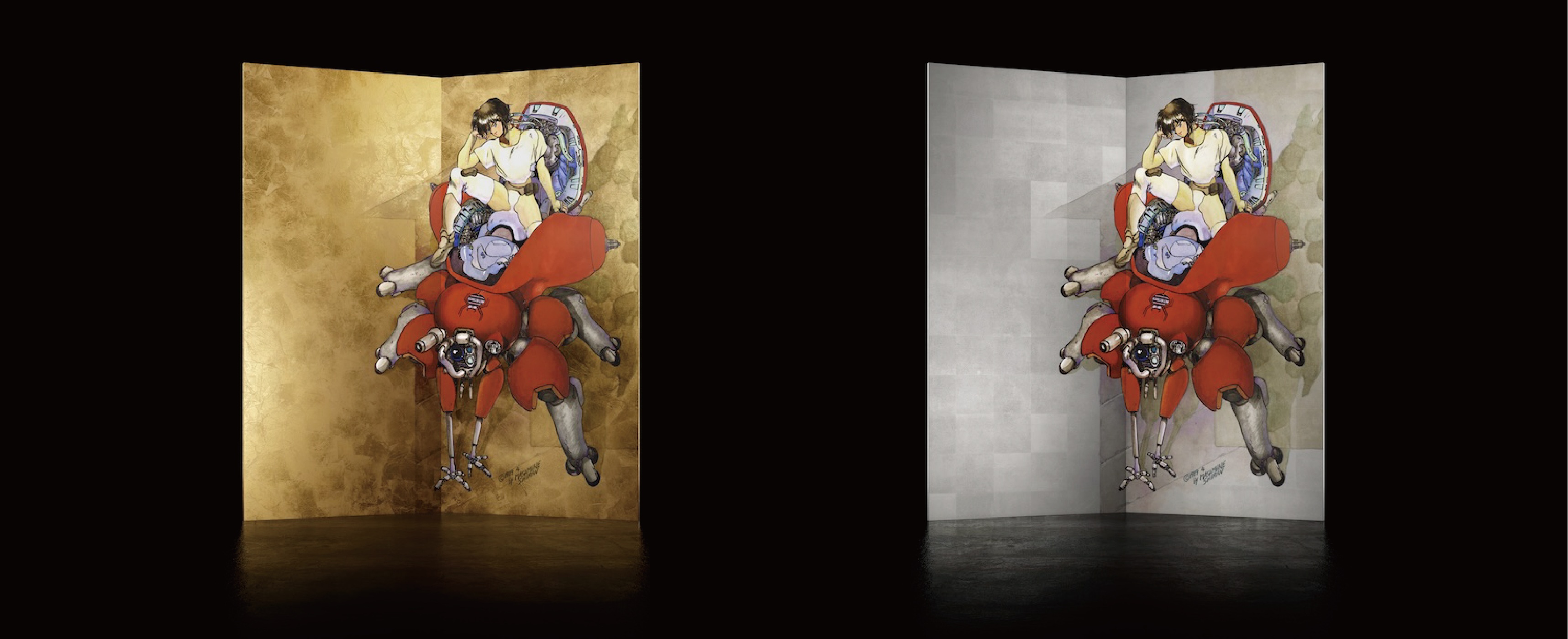 第2弾となる「TB-02:The Ghost in the Shell」シリーズは、屏風という物理的なメディウム上に『攻殻機動隊』のサイバネティックなヴィジュアルを配した、過去と未来が交錯する新世代ヴィジュアルアート。漫画原作扉絵のフチコマに搭乗する草薙素子をあしらったTB-02-KP(魂魄)と、95年アニメ映画版のワイヤーを接続した草薙素子のヴィジュアルを用いたTB-02-GT(義体)の2つの絵柄を、洋金箔、錫箔の2種の箔で表現した、計4種をラインナップする。