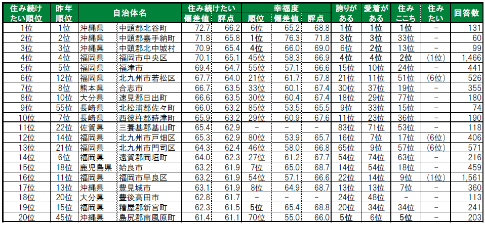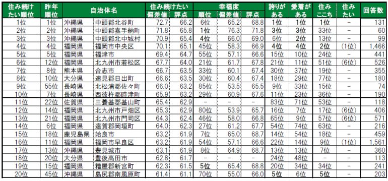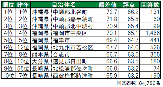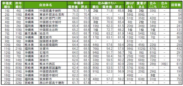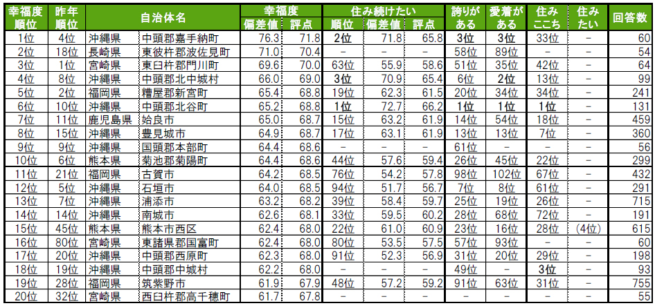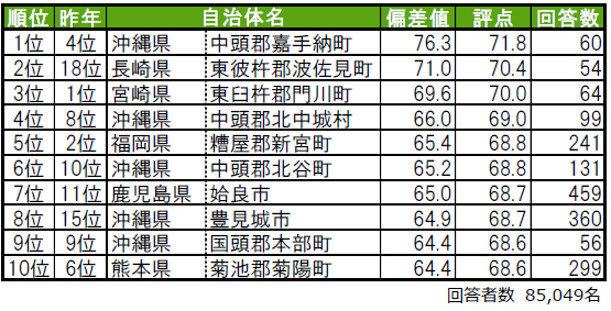 街の幸福度ランキングでは、沖縄県中頭郡嘉手納町が、昨年4位から順位を上げて1位に輝いた。2位は長崎県東彼杵郡波佐見町で、昨年18位から大きく順位を上げた。3位は宮崎県東臼杵郡門川町となった。トップ10のうち8つが、沖縄県・長崎県・宮崎県・福岡県・熊本県の郡部に属する「町」や「村」という結果になっている。