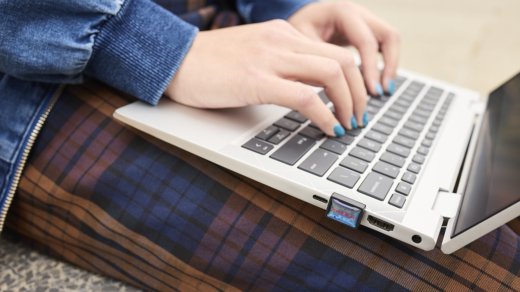 本製品は、携帯性を損なうことなくノートパソコンやタブレットに接続できる、超コンパクトサイズのType-C対応USBメモリ。一度差し込むとしっかり固定される設計で、会議の合間の移動や通勤、通学の際も抜け落ちることなくしっかりとフィットする。