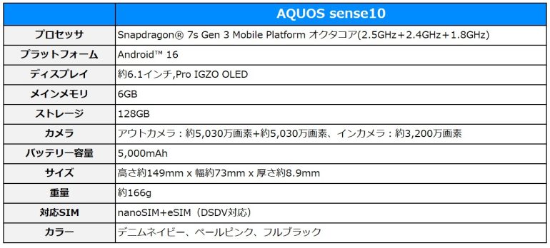 「AQUOS sense10」は、約6.1インチの有機ELディスプレイを搭載したシャープ製スマートフォン。プロセッサはSnapdragon 7s Gen 3を採用し、メモリは6GB、ストレージは128GBを内蔵。また、AIが周囲の雑音を消し、人の声だけを抽出することで快適な会話をサポートする、シャープ独自の機能「Vocalist」も搭載する。