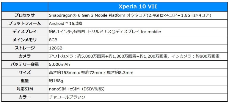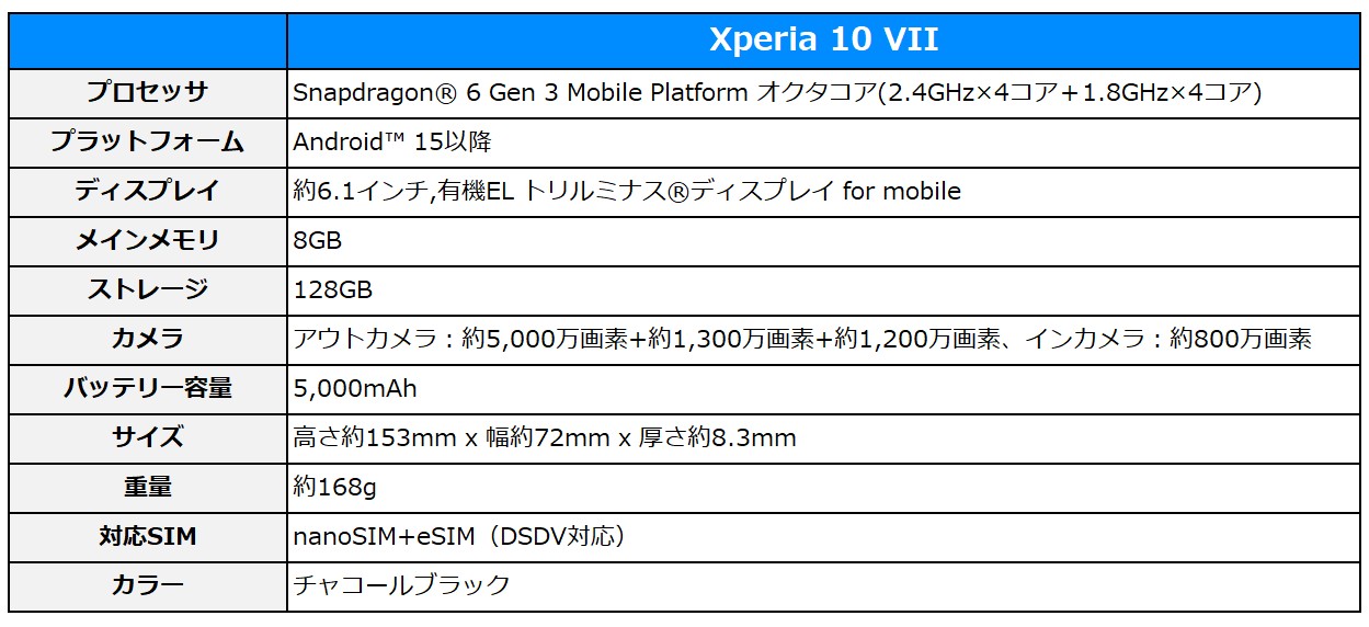 「Xperia 10 VII」は、約6.1インチの有機ELディスプレイを搭載したソニー製スマートフォン。プロセッサはSnapdragon 6 Gen 3を搭載し、メモリは8GB、ストレージは128GBを内蔵。本体側面に即撮りボタンを搭載しているのも特長で、これにより、画面を見ることなく、ボタンを長押しするだけで迷うことなくカメラを起動でき、素早く撮影ができる。