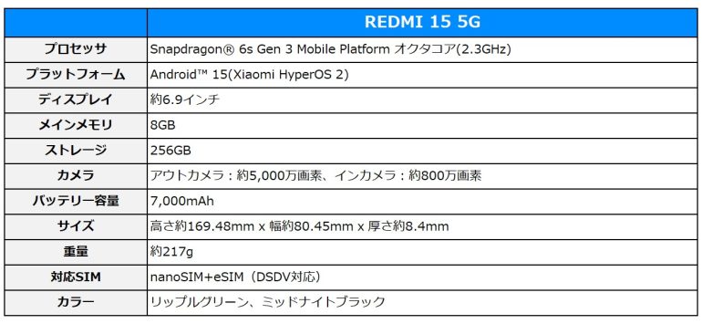 「REDMI 15 5G」は、約6.9インチの液晶ディスプレイを搭載したXiaomi製スマートフォン。プロセッサはSnapdragon 6s Gen 3を搭載し、メモリは8GB、ストレージは256GBを内蔵。さらに、7,000mAhの大容量バッテリーを搭載し、33W急速充電と18Wのリバース充電にも対応する。