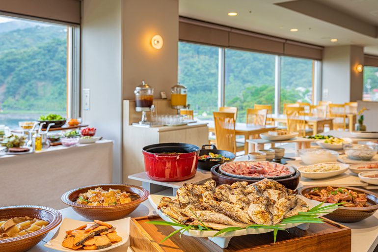 夕食は素材の旨みを引き出した月替わりの和食コースを、朝食は干物や焼き立ての品が並ぶ約50種類の和洋食バイキングを用意。窓一面に広がる大海原を眺めながら、心満たされるひとときを過ごせる。