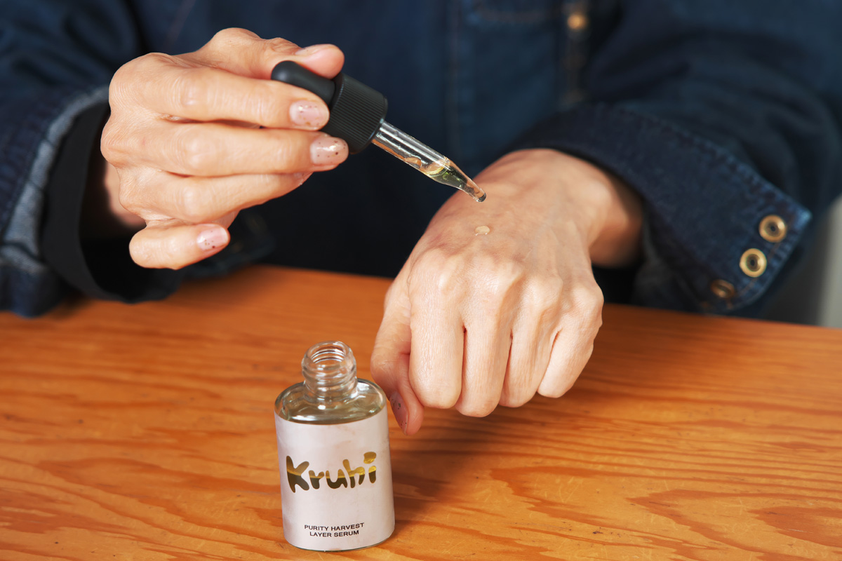 あい:肌質や年齢を問わず使っていただけるように設計しました。水分と油分の二層構造になっているのは、あえて乳化剤を使用しないKruhiのこだわりです。潤いを「届けて、守る」が、これ1本でできる。Kruhiはどのアイテムも成分中の“水”を、植物蒸留水に置き換えているんです。蒸留水にすることで、水の中の不純物も取り除かれ、植物の香りも楽しめる。大地のエネルギーを、ふんだんに肌に感じていただきたいです。