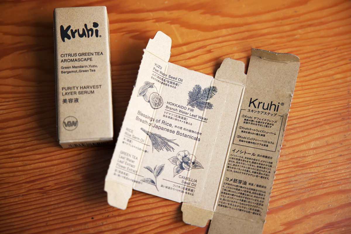 あい:美容液の水層には、奈良県産のチャ葉水や高知県産のユズ果皮水などを使っています。さらにユズや青みかん、ベルガモットなどの精油を合わせていて、ユズ緑茶を思わせる香りで、CITRUS GREEN TEAという名前を付けています。Kruhiでは天然精油のみで香りをつけていて、クレンジングの香りには「OVER THE MOON AROMASCAPE」という名前がついているんですよ。