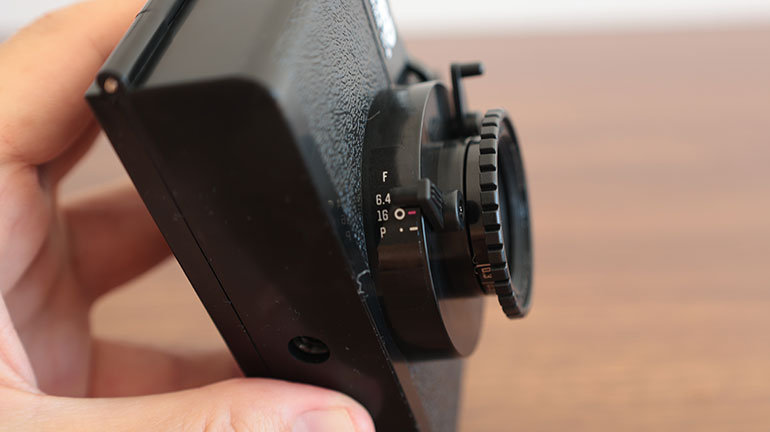 次に細かい部位をチェック。レンズの周囲には3つのレバーがある。下のレバーは絞りで、F6.4、F16、F100のいずれかに切り替えできる。
