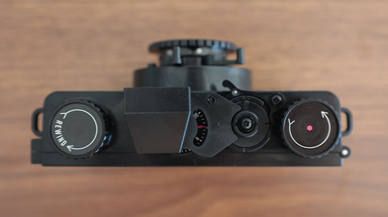 中央のダイヤルはフィルムカウンターで今、何枚目までのフィルムを使ったかをこれで記録する。でっぱりは、素通しの光学ファインダーだ。