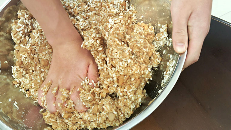 塩切りこうじに、つぶした大豆を混ぜ合わせ、耳たぶくらいの柔らかさになるくらい混ぜる。つぶし切れていなかった大豆も、ここでつぶしておこう。