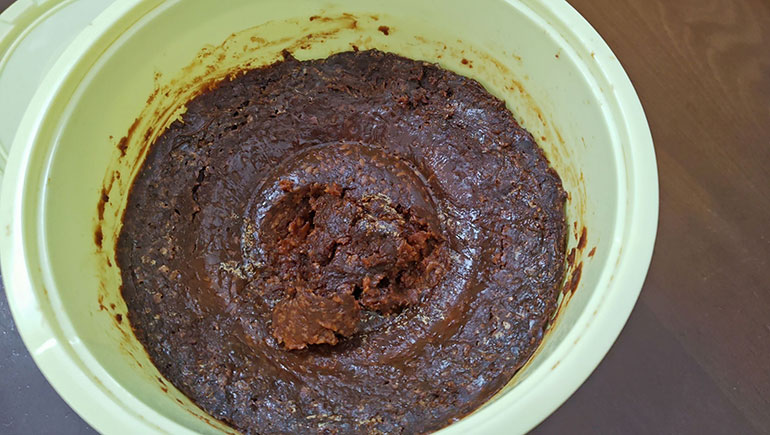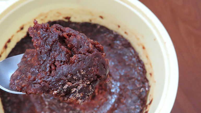 量が増えると、熟成期間の途中で、蓋を開け、切り返しという、熟成が満遍なく進むようにお味噌の上下を入れ替える作業が必要になる。また、簡単に仕込むための一番のポイントは、煮大豆を使うことだ。