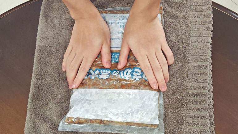 大豆は、すでに煮たものを使うが、冷めているときよりも温かい方がつぶしやすいため、温めるのがおすすめ。湯せんが大丈夫なパッケージの場合、そのまま温め、つぶすときも、袋のままつぶすと飛び散る心配もない。
