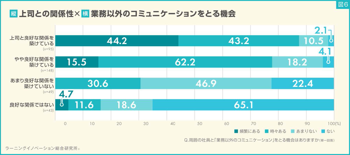 社会人1年目の若手社員335人に対して、周囲の社員と業務以外のコミュニケーションをとる頻度について質問すると、上司と「良好な関係を築けている」と回答した若手社員のうち、44.2%が周囲の先輩と業務以外のコミュニケーションをとる機会が「頻繁にある」と回答した。上司と「良好な関係ではない」と回答した若手社員では、65.1%が周囲の先輩と業務以外のコミュニケーションをとることが「ない」と回答した。