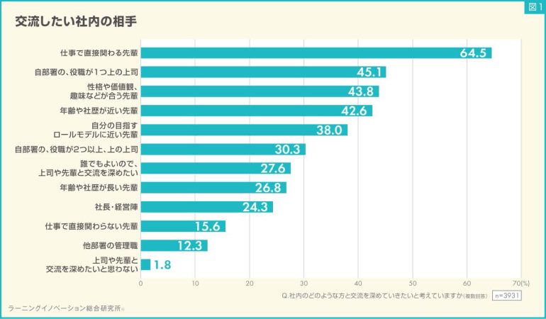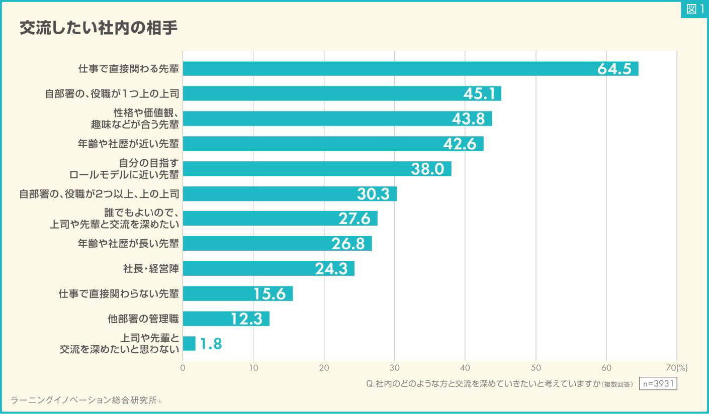 社内のどのような相手と交流を深めたいかについては、1位は64.5%が回答した「仕事で直接関わる先輩」だった。それに「自部署の役職がひとつ上の上司」(45.1%)、「性格や価値観、趣味などが合う先輩」(43.8%)が続いた。