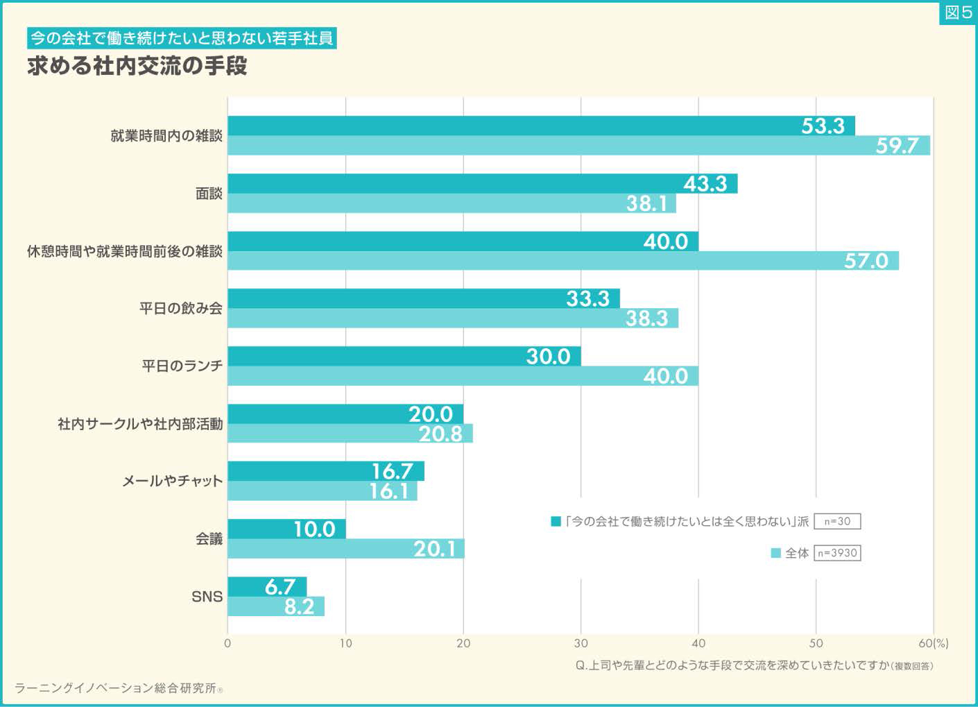 どのような状況であれば今の会社で働き続けたいと思うかについて「今の会社で働き続けたいとはまったく思わない」と回答した新入社員30人に、求める社内交流の手段を質問すると、働き続けたいと思わない層では「就業時間内の雑談」(53.3%)がもっとも高い割合だったが、3930人全体の回答割合と比較すると6.4ポイント低くかった。それに「面談」が43.3%で続き、全体の回答割合と比較して5.2ポイント高かった。全体の社員ともっとも差が開いた項目は「休憩時間や就業時間前後の雑談」(40.0%)で、17.0ポイントも低かった。今の会社で働き続けたいと思わない社員は、就業時間外の雑談より面談による交流を求めているようだ。