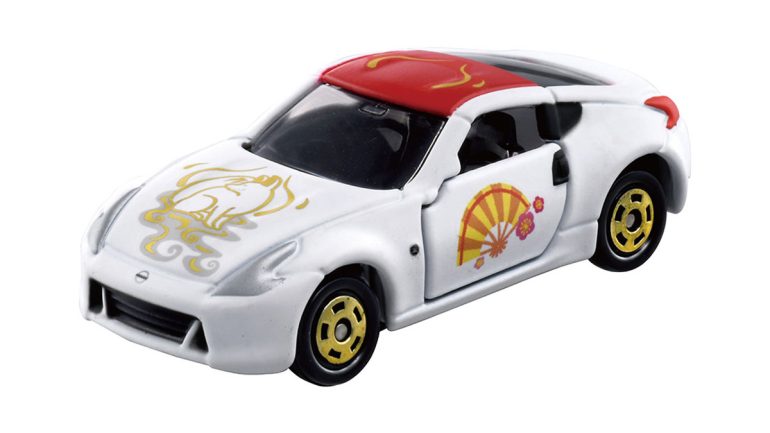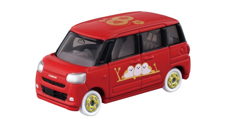 人々に幸運をもたらす白い狐の白虎をイメージした白いボディと赤いルーフに幸運を運ぶ白狐が入っている。車体横には、お正月をイメージした扇と梅をデザイン。サイズ:幅32.3mm×高さ23.8mm×奥行き73.7mm。アクション:サスペンション、左右ドア開閉。