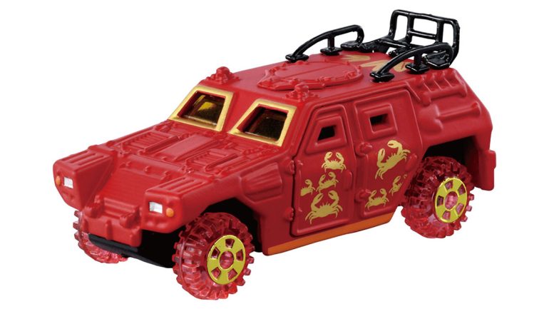 子孫繁栄、幸福の意味を持つ蟹がはさみを動かして幸運を招く姿を車体にデザイン。クリアレッドのタイヤは 水辺にいる蟹をイメージしている。サイズ:幅32.3mm×高さ32mm×奥行き68.3mm。アクション:サスペンション、左右ドア開閉。
