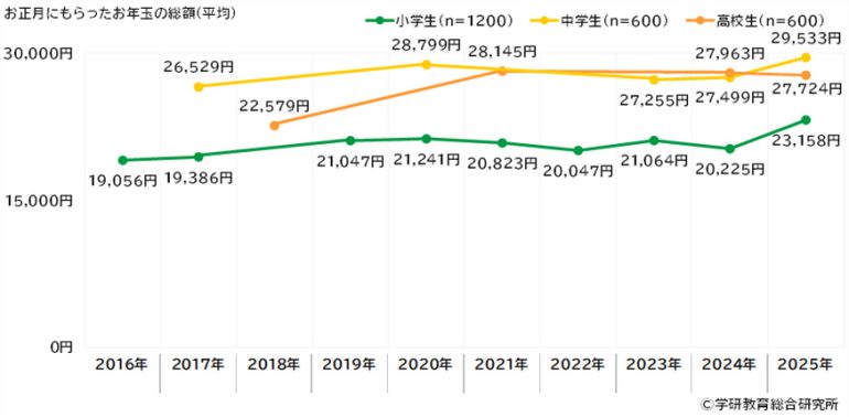 今年(2025年)のお正月にもらったお年玉の総額(すべてを足した額)をきいたところ、小学生では平均23,158円、中学生では平均29,533円、高校生では平均27,724円であった。