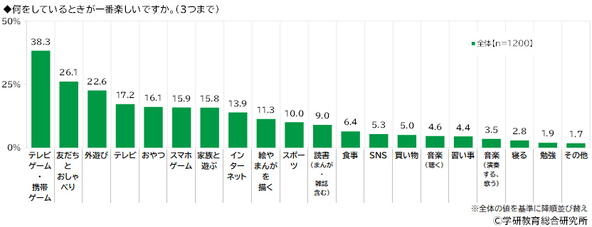 何をしているときが一番楽しいかをきいたところ、1位「テレビゲーム・携帯ゲーム」(38.3%)、2位「友だちとおしゃべり」(26.1%)、3位「外遊び」(22.6%)となった。