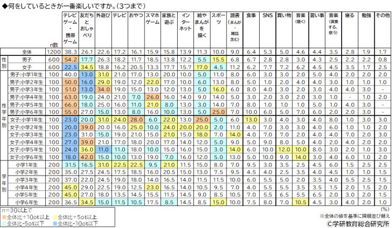男女別にみると、男子では1位「テレビゲーム・携帯ゲーム」(54.2%)、2位「外遊び」(26.3%)、3位「スマホゲーム」(18.5%)、女子では1位「友だちとおしゃべり」(34.5%)、2位「テレビゲーム・携帯ゲーム」(22.5%)、3位「おやつ」(20.5%)という結果に。