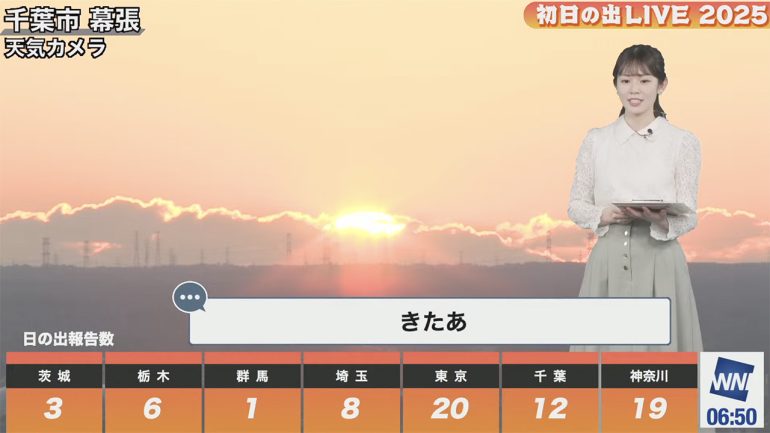 また、24時間生放送の気象情報番組「ウェザーニュースLiVE」では、2026年元日に国内6か所から初日の出を生中継する。