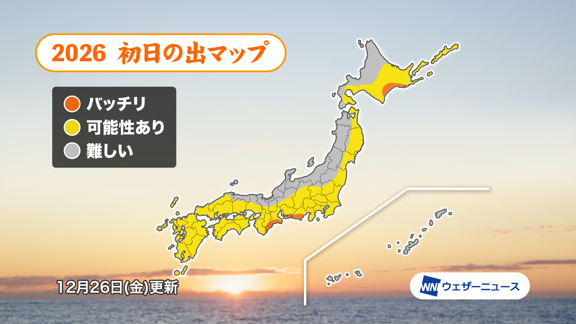2026年の元日は西高東低の冬型の気圧配置となり、北海道の太平洋側と東海の太平洋側の一部地域では晴れて初日の出を見られる可能性が高い見込み。