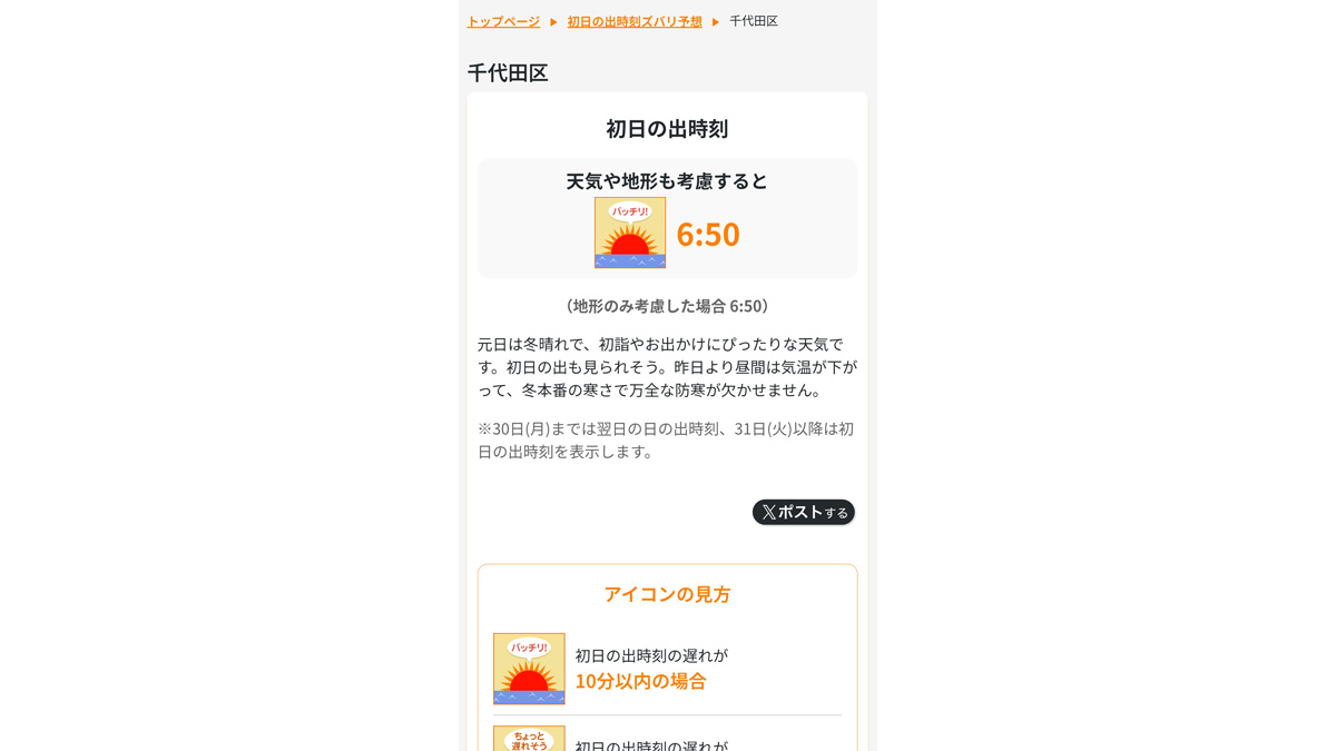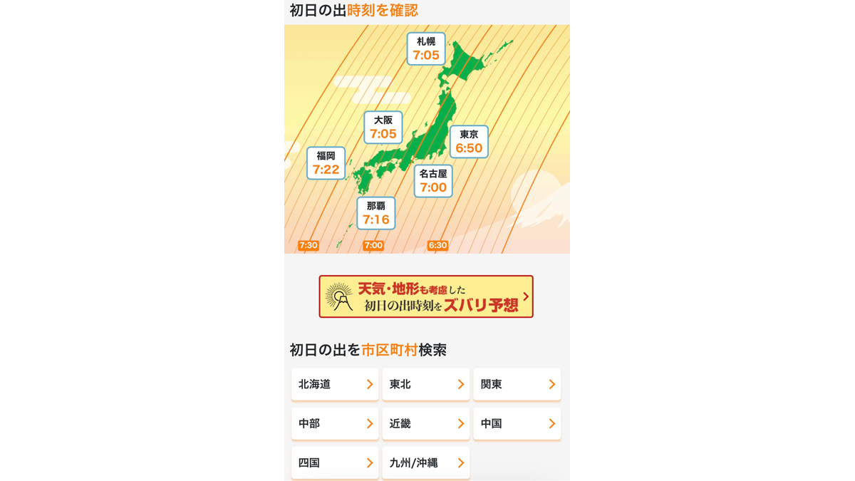 『初日の出情報』では独自の日の出時刻予想を活用した『初日の出時刻ズバリ予想』を提供する。