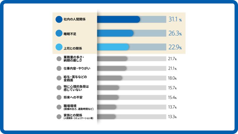 特に高かった回答は「社内の人間関係」(31.1%)がトップで、「睡眠不足」(26.3%)、「上司との関係」(22.9%)、「業務量の多さ・納期の厳しさ」(21.7%)が続いた。この結果から、現代人の心理的負荷は、最も身近で避けられない「職場の人間関係」が最大の要因であり、仕事にまつわる要因が多くを占めていることがわかった。