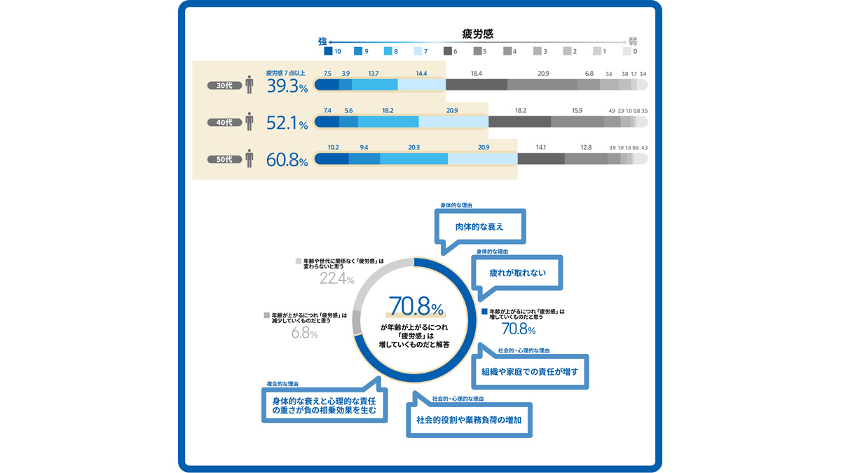 多くの現代人が、自身の体力の衰えを自覚しつつも、組織や家庭での責任が増すことで「疲労感が増していくのは避けられない」と感じている背景が浮き彫りになった。