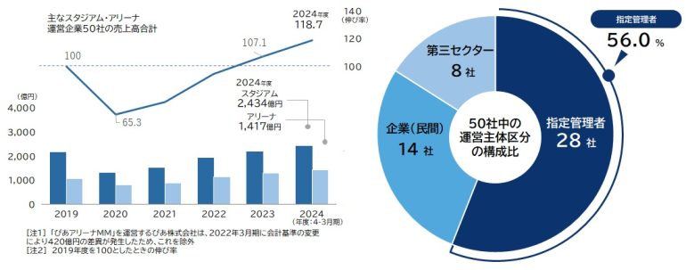 スタジアム・アリーナ運営主要50社の2024年度の売上高合計は3,851億円となり、2019年度から18%増と急拡大を遂げている。同調査では、その背景要因はもちろん、今後の展望についても分析。以下は、その内容となる。