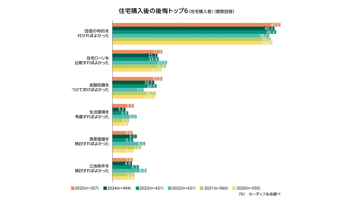 住宅購入後の最大の後悔は、「団信の特約を付けておけばよかった」(42%)が6年連続1位(図表3-1)。