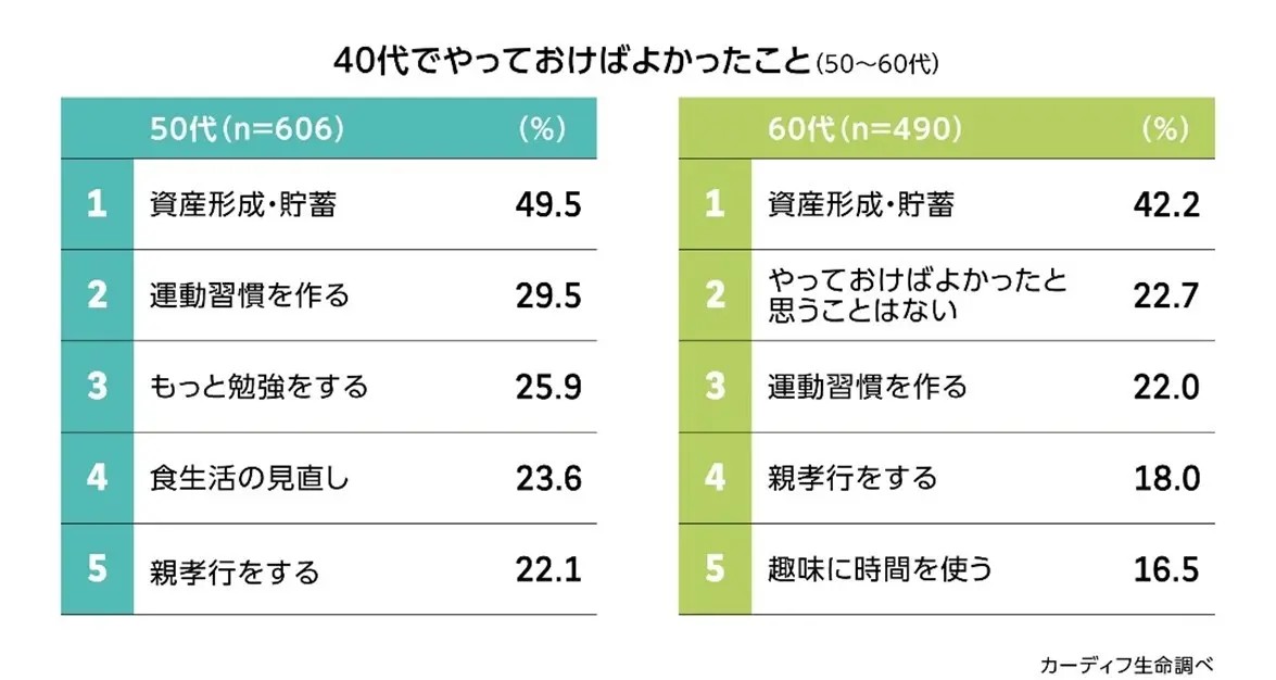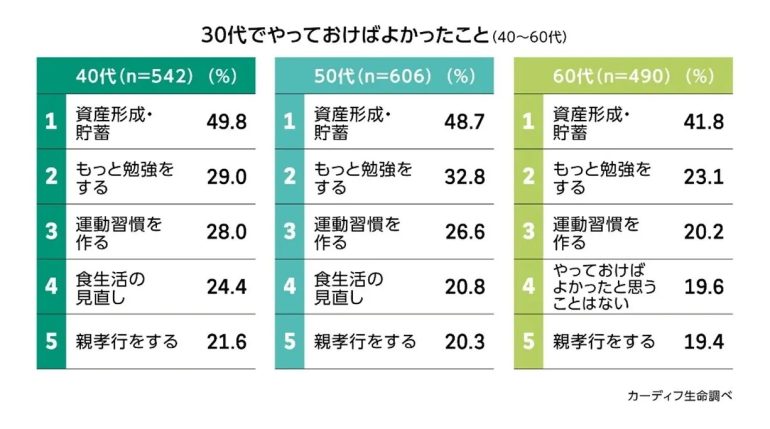 どの年代の回答者も20代・30代・40代でやっておけばよかったことの1位は「資産形成・貯蓄」。一方で60代は、「やっておけばよかったと思うことはない」との回答が他の年代より多く見られた(図表5-1)。