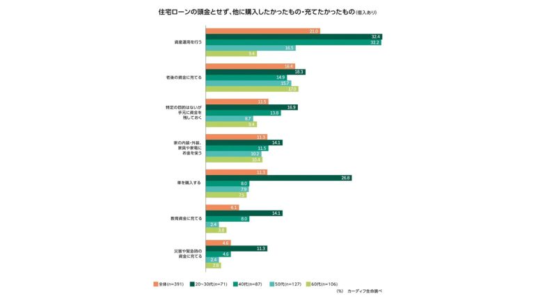 住宅ローン利用者に、頭金に充てずに他に購入したかったものや購入すればよかったものを聞いたところ、「資産運用を行う」が1位で21%。特に20~40代では32%にのぼり、若年層の投資への関心の高さがうかがえた(図表5-2)。
