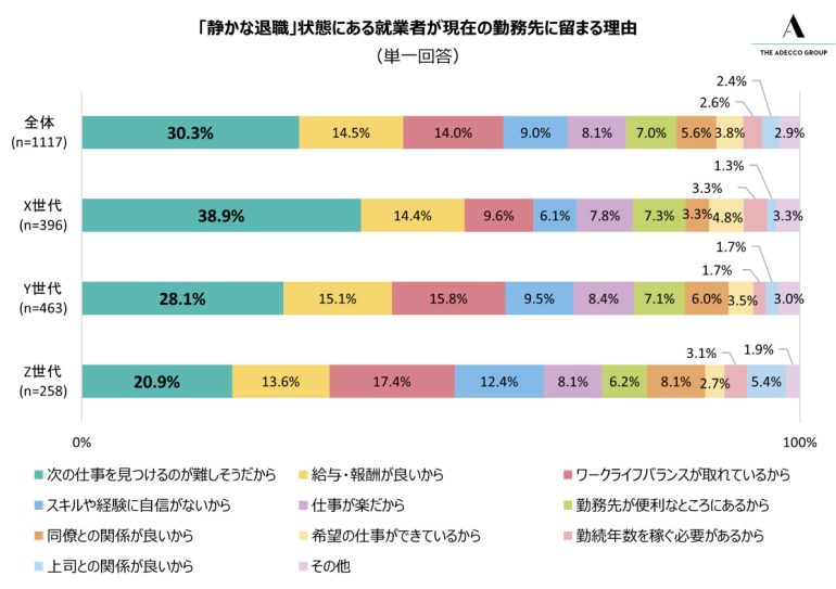 続いて、「静かな退職」状態にあるものの、現在の勤務先での仕事を続ける考えを持っていたX・Y・Z世代の就業者1,117人に対し、「現在の勤務先での仕事を続ける理由は何ですか?」と質問したところ、もっとも多く挙げられた理由は、「次の仕事を見つけるのが難しそうだから」(30.3%)となった。