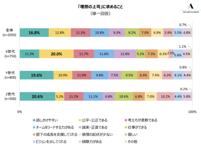 続いて、「あなたが『理想の上司』に求めることは何ですか?」と質問したところ、求めることとしてもっとも多く挙げられたのは、「話しかけやすい」(16.8%)となった。「話しかけやすい」は、Z世代とY世代でもっとも求めることのトップになった。一方、X世代では、「公平・公正である」がトップとなった。