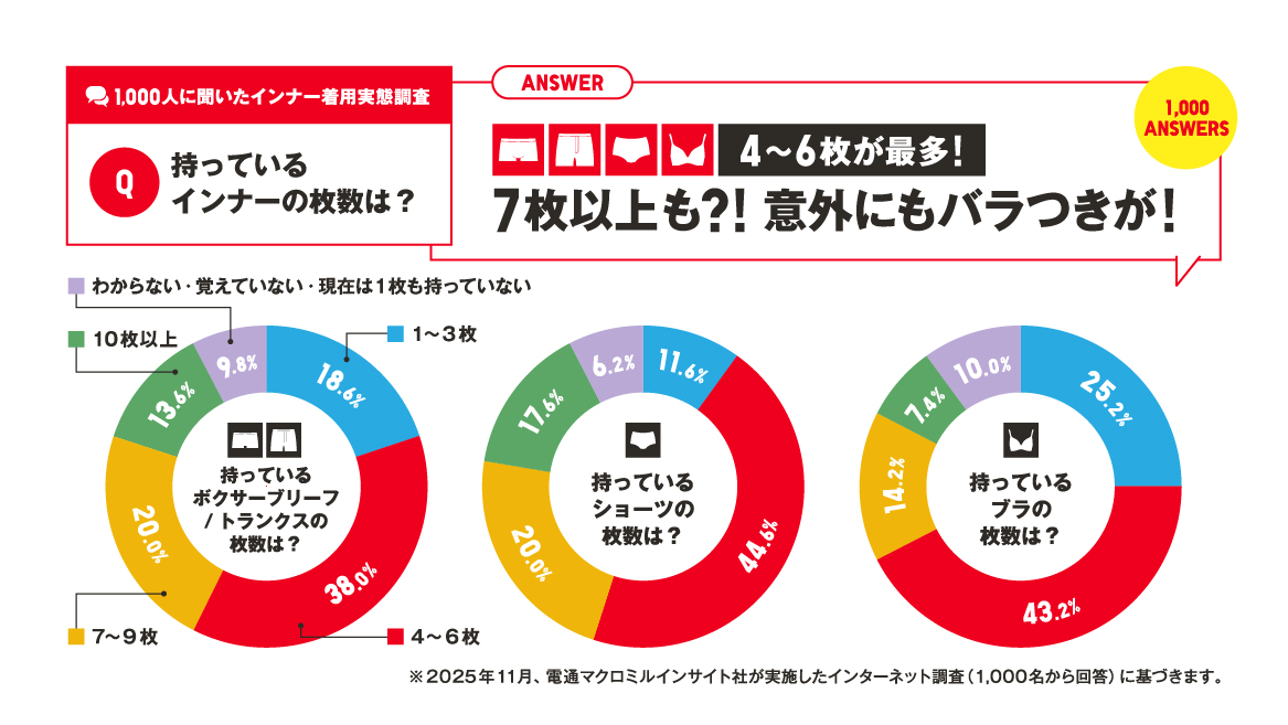 そんな“リアルな着用実態”を明らかにするため、ユニクロはこのほど、全国の男女1,000人を対象に「インナー類(ブラ、ショーツ、ボクサーブリーフ、トランクスなど)に関する着用調査」を実施し、その結果を発表した。