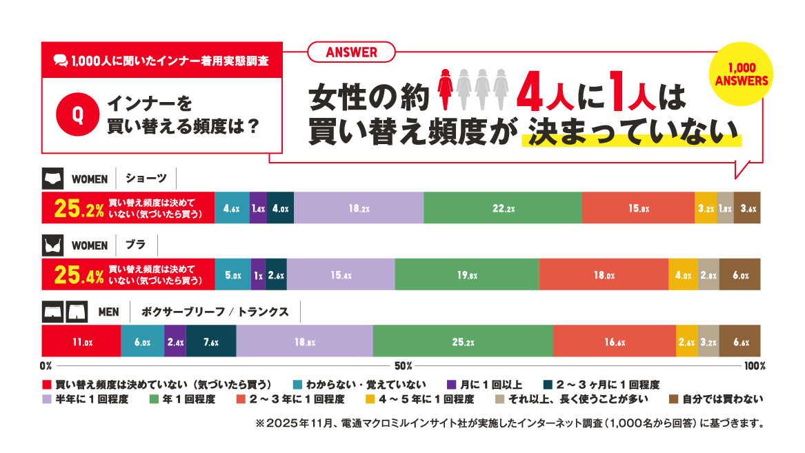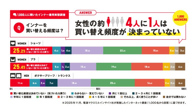 また、インナーの買い替え頻度について聞いたところ、ボクサーブリーフ/トランクスは「半年に1回程度」・「年1回程度」と、男性の約4割が比較的短いサイクルで買い替えを行っている一方、ブラやショーツでは約25%の女性が「買い替え時期を決めていない」と回答。