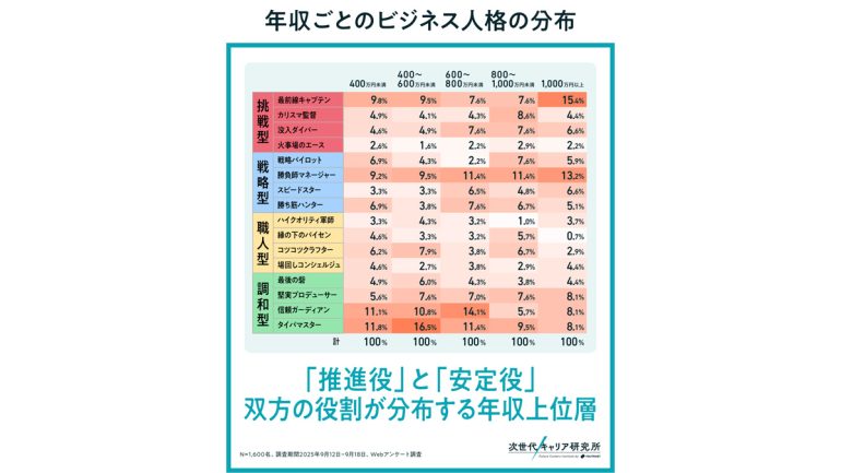 また、中間層(400~600万円帯)では「タイパマスター」が16.5%と最も高く、「信頼ガーディアン」も600~800万円帯で14.1%を占めている。効率化や確実な実務遂行を担うタイプが、中間層を厚く支えている構造がうかがえる。