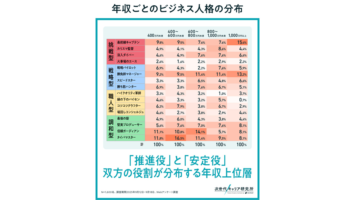 高年収帯(1,000万円以上)では、前線で成果責任を担う推進役タイプの比率が高まる傾向が見られた。