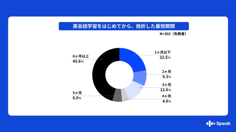 英会話学習を始めてから挫折するまでの期間を聞いたところ、失敗者の44.4%が3ヶ月以内(1ヶ月以下22.5% + 2ヶ月9.3% + 3ヶ月12.6%)に学習を辞めていることがわかった。