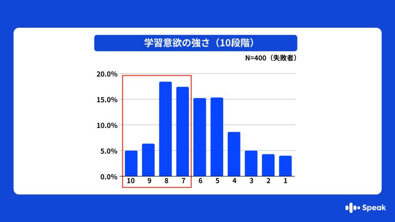 失敗者の学習開始時の意欲(モチベーション)は10点満点中「7~10点」の高得点者が多く、やる気不足が原因ではないことがうかがえる。