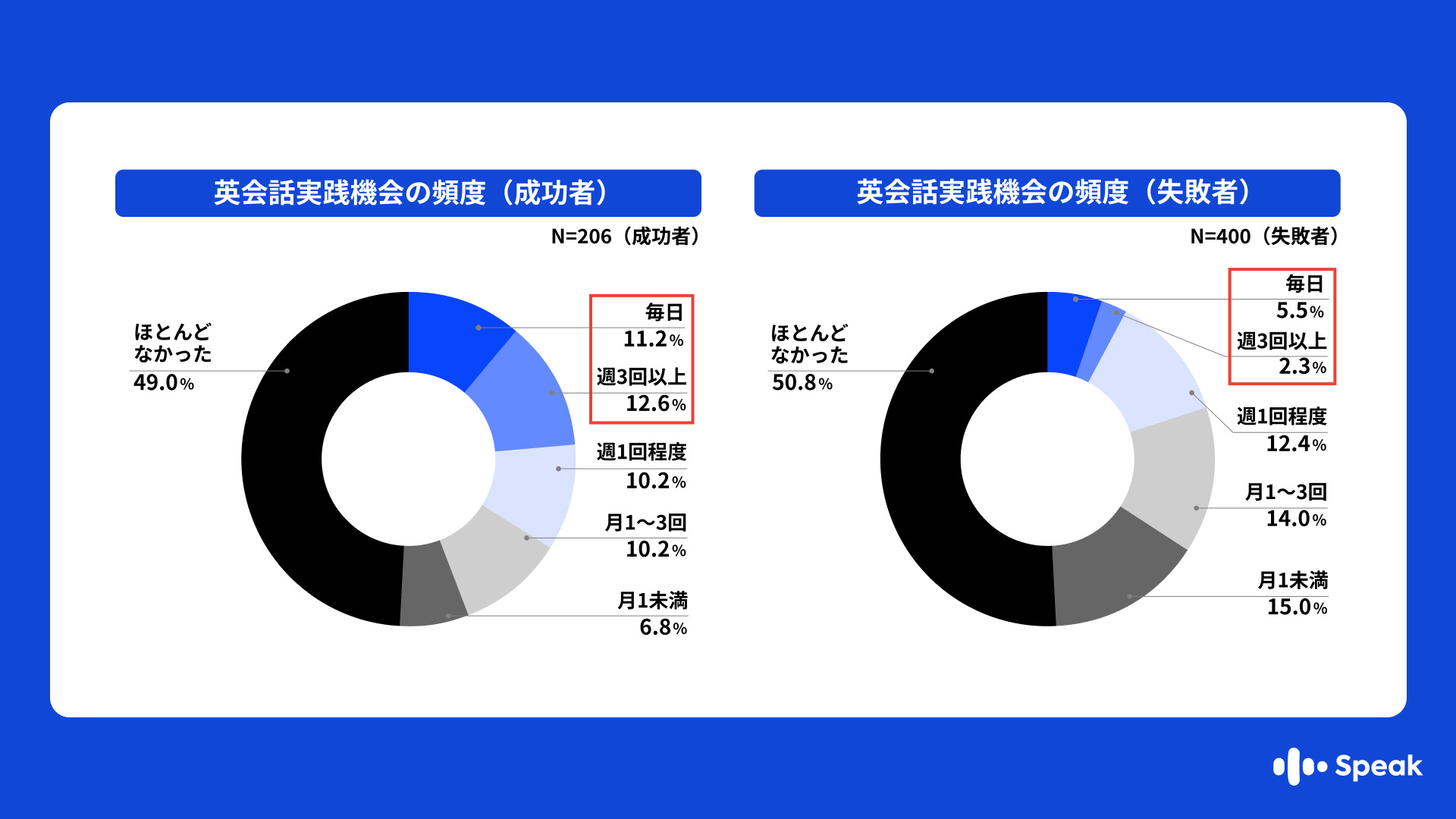 「英語を話す実践機会(AI等を含む)をどのくらい設けていたか」を尋ねたところ、成功者と失敗者で大きな差が生じた。 成功者の23.8%(毎日11.2%+週3回以上12.6%)が「週3回以上」話す機会を持っていたのに対し、失敗者で同頻度を確保できていたのはわずか7.8%(毎日5.5%+週3回以上2.3%)にとどまり、これは約3倍の開きがあった。