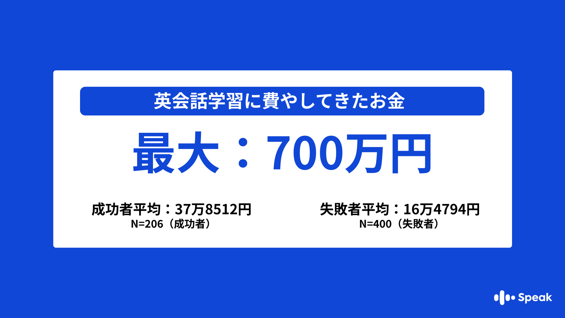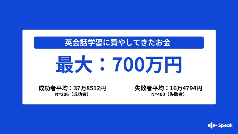 英会話学習に過去費やしてきた合計のお金事情を聞いたところ、成功者206名の平均が37万8512円、失敗者400名の平均は16万4794円と倍以上の差が生まれた。