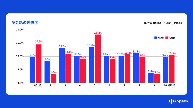 「英語を話すこと」に対する恐怖度を10点満点で聞いたところ、恐怖度が最大の「10点」と回答した人の割合は、成功者が9.7%、失敗者は10.5%とほとんど差が見られない結果となった。