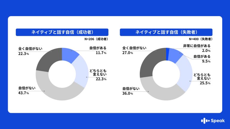 また、ネイティブの英語を話す外国人に対して、自分の意志を伝える自信はあるか英会話力に関して質問をしたところ、自信がある(非常に自信がある、自信があると回答した合計)と答えたのは成功者11.7%、失敗者11.5%とあまり差がなかった。英会話学習を継続していてもネイティブと話す自信を持てない人が多く、日本人の英語に対する苦手意識が見て取れた。