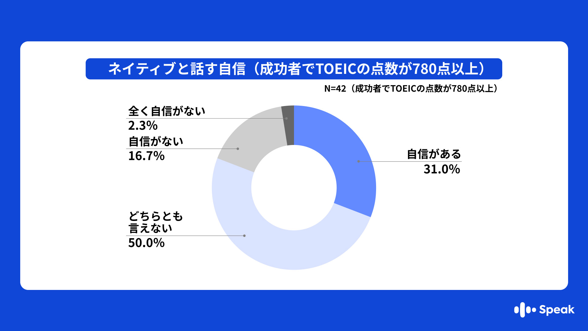 英会話学習成功者で、TOEICの点数が780点以上と高得点の方に限定して、同じく英会話力の自信を確認すると、自信がある(非常に自信がある、自信があると回答した合計)と答えたのはわずか31.0%に留まった。