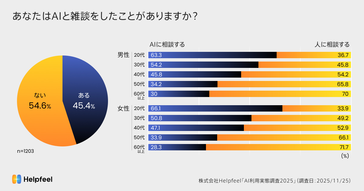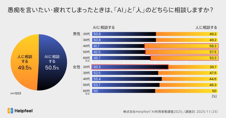 企業のAIを強くする「AIナレッジデータプラットフォーム」を提供するHelpfeelは、AIの利用経験がある全国の20代以上を対象に「日常の悩みや困りごとをAIと人のどちらに相談するのか」をテーマとした実態調査を実施した。