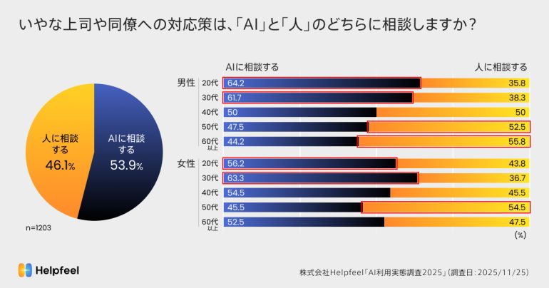 いやな上司や同僚への対応策に関する相談では、全体は「AIに相談する」(53.9%)が「人に相談する」(46.1%)を上回った。年代別では20代(男性64.2%・女性56.2%)、30代(男性61.7%・女性63.3%)はAIへの相談が過半数で、若年層ほどAIを選んでいた。